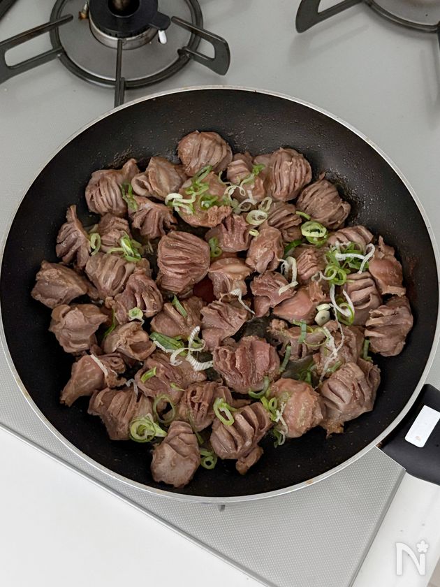 (3) フライパンに、銀皮を取り除いた砂肝を入れ、中火で7分ほど炒め、青ねぎを散らす。