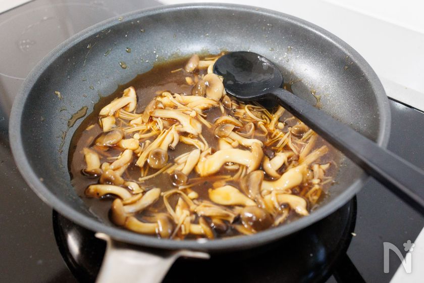 (3) 2のフライパンを中火で熱し、しめじとえのきをしんなりするまで炒める。【B】を加えて煮立ったら、【C】でとろみをつける。