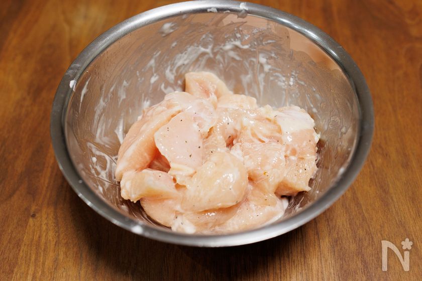(1) 鶏むね肉は削ぎ切りにして一口大に切る。ボウルに鶏肉と【A】をよくもみ込み、片栗粉を加えて満遍なくまぶす。