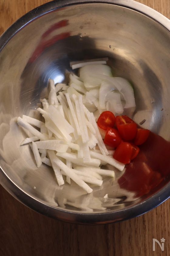 (1) ボウルに大根・玉ねぎ・ミニトマトを入れ、塩を加えて軽くもみ、5〜10分置いて水分を出す。