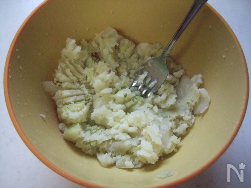 (1) ジャガイモを皮つきのままレンジ600Wで5~6分加熱して柔らかくなったら、皮をむいてマッシュする。