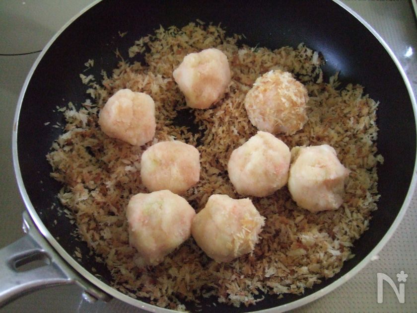 (3) 丸めた明太ポテトを炒めたパン粉に絡める。