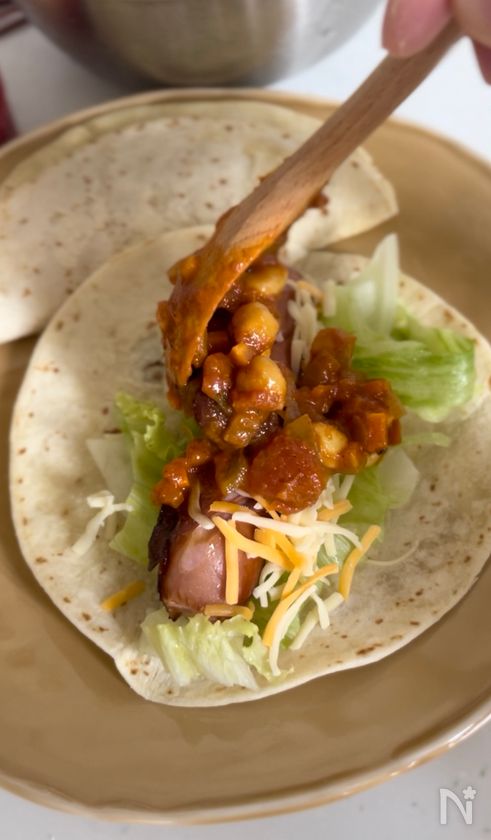 レンチンソースの【ジョンソンヴィルと豆のスパイシータコス】