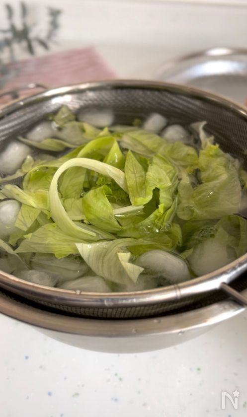 (下準備) レタスは1cm幅に切り、氷水に5分つけてシャキッとさせてから、ざるにあげて水けを切る。