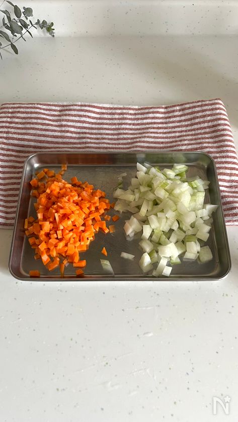 (1) 玉ねぎ、にんじんはみじん切りにする。