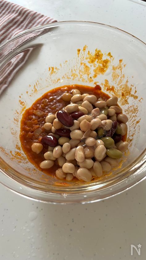 (2) 耐熱ボウルに1、【A】を入れて混ぜ、ふんわりとラップをかけて電子レンジ(600W)で5分加熱する。取り出して全体を混ぜ、汁けをきったミックスビーンズを加えて、再度ふんわりとラップをかけて、電子レンジ(600W)で3分加熱する。