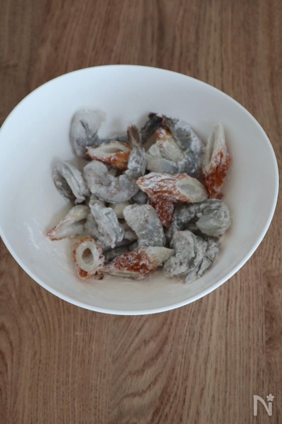 (下準備) ・背わた取りえびは半解凍し、殻をむき、余分な水分をキッチンペーパーで拭き取っておく。