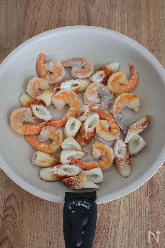 (2) 中火で熱したフライパンにごま油をひき、えびとちくわを入れたらえびの表面の色が変わるまで炒める。