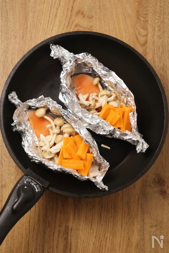 (1) ホイルの上に解凍した定塩銀鮭切身をのせ、その上にしめじとにんじんを重ねる。ホイルの両端をねじってしっかりと包み、具材や汁がこぼれないように形を整えたらフライパンに並べる。同様にもう1個作る。