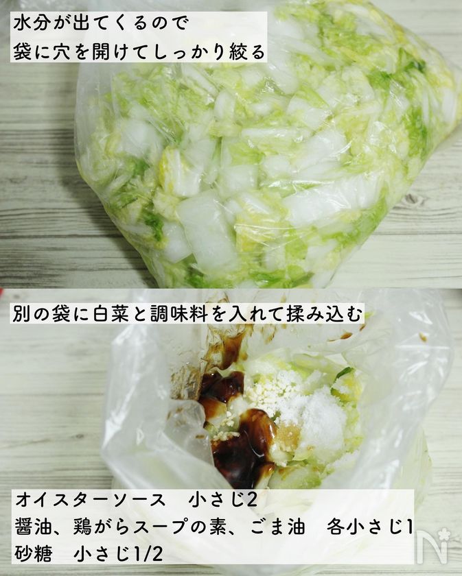 (4) 別の袋に白菜と調味料【A】を入れて揉み込む。
