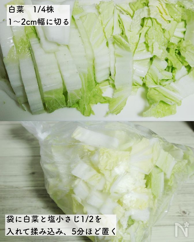 (2) 袋に白菜と塩を入れて揉み込み、5分ほど置く。