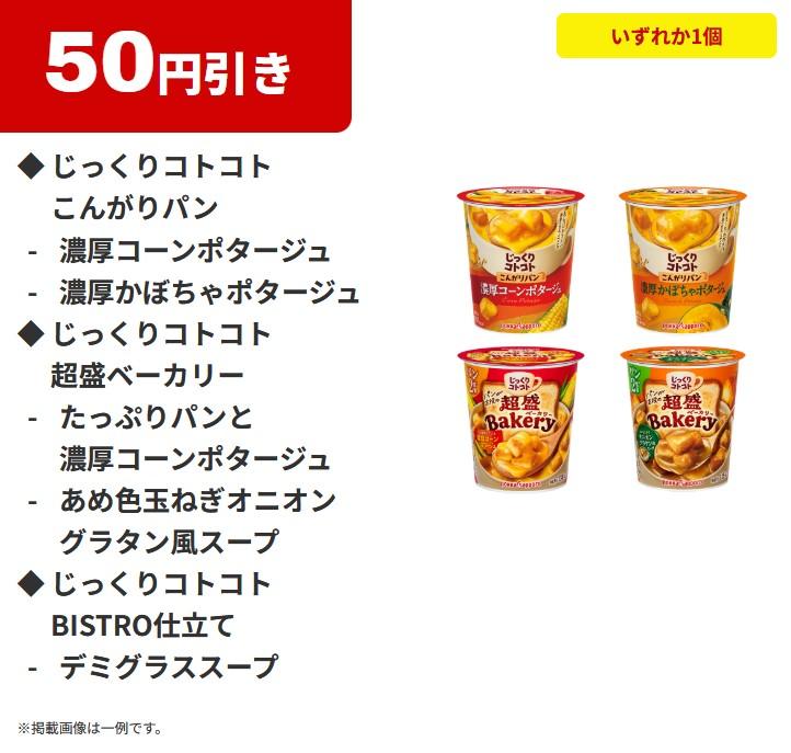 4月7日から5月4日までの期間、「じっくりコトコトこんがりパン」の「濃厚コーンポタージュ」「濃厚かぼちゃポタージュ」、「じっくりコトコト超盛ベーカリー」の「たっぷりパンと濃厚コーンポタージュ」「あめ色玉ねぎオニオングラタン風スープ」、「じっくりコトコトBISTRO仕立て デミグラススープ」のいずれか1個に使える50円引きファミペイクーポンを配信しています。