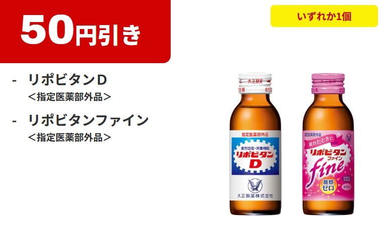4月7日から5月4日までの期間、「リポビタンD」「リポビタンファイン」のどちらか1個に使える50円引きファミペイクーポンを配信しています。