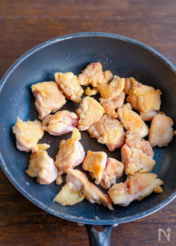 (1) 鶏もも肉はひと口大に切り、塩・こしょうを揉みこんでから片栗粉をまぶす。