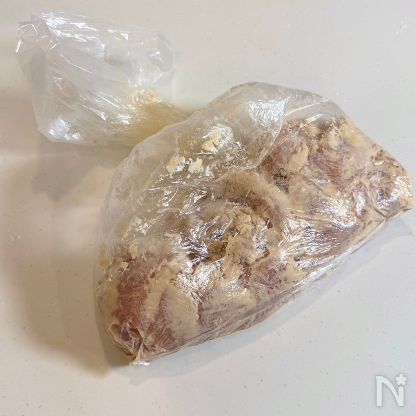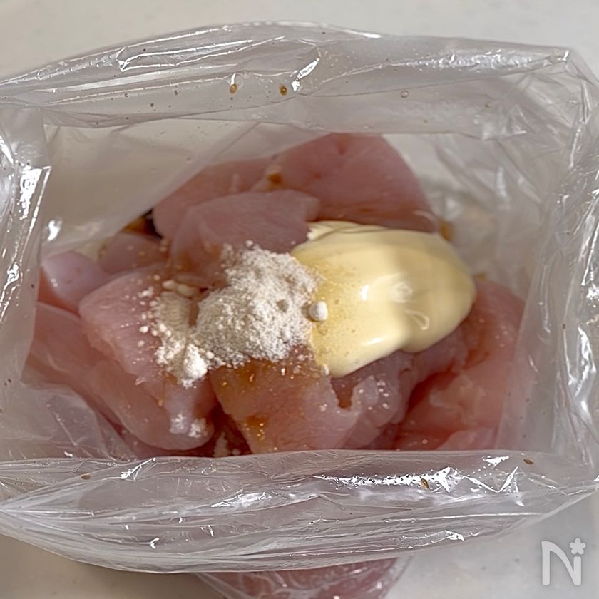 (2) ポリ袋に鶏肉と【A】を入れ揉み込み、10分以上置く。