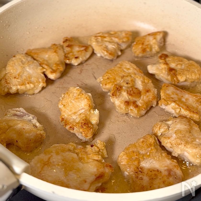 (5) フライパンにサラダ油をひき、中火で鶏むね肉が両面こんがりするまで焼く。