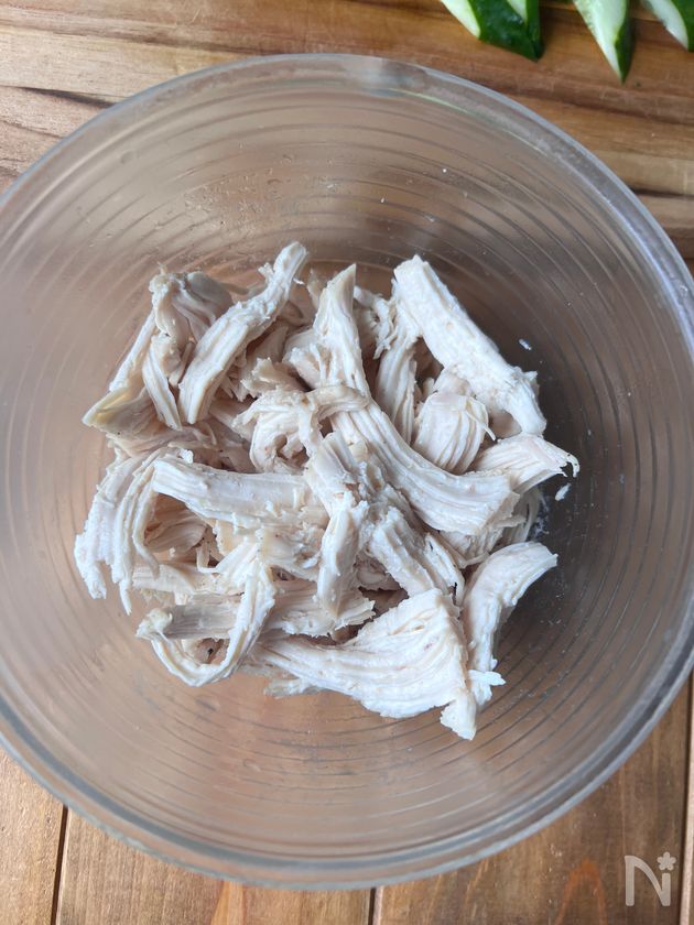 (3) むね肉のあら熱が取れたら余計な水分を捨て、割いていく。