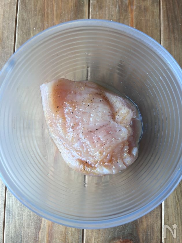 (1) 耐熱容器にむね肉をいれたら、酒、砂糖、塩こしょうを揉み込む。