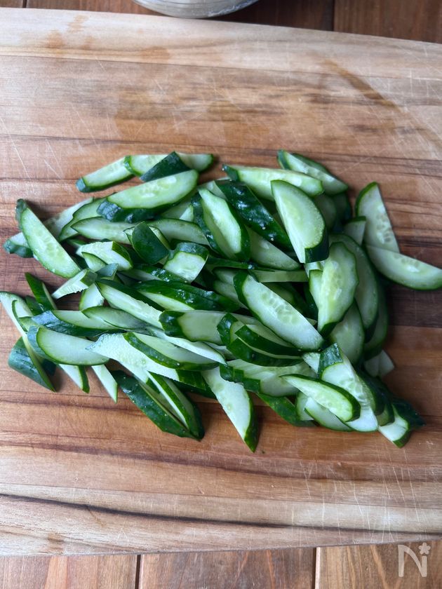 (2) きゅうりは縦半分に切り、さらに薄切りにする。