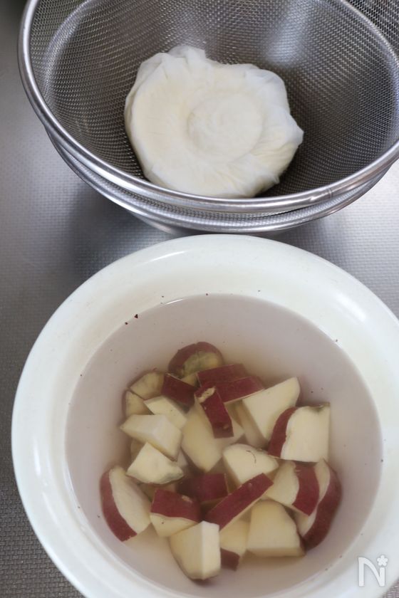 さつまいもは7mm幅程度の半月切りにして10分ほど水にさらしておく。