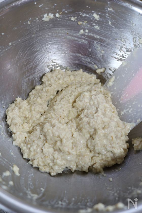 (4) ①の豆腐を手で包むようにしてぎゅっと搾ってしっかり水気を切ったら、ボウルに入れ、【A】を加えて泡立て器やゴムベラで豆腐の塊を潰しながら滑らかになるまで混ぜる。