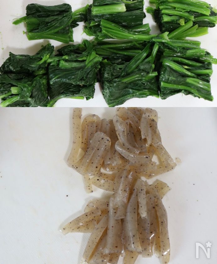 (3) ほうれん草は2〜3分塩茹でしたら冷水にとり、水気をぎゅっと搾って4cm幅程度に切る。