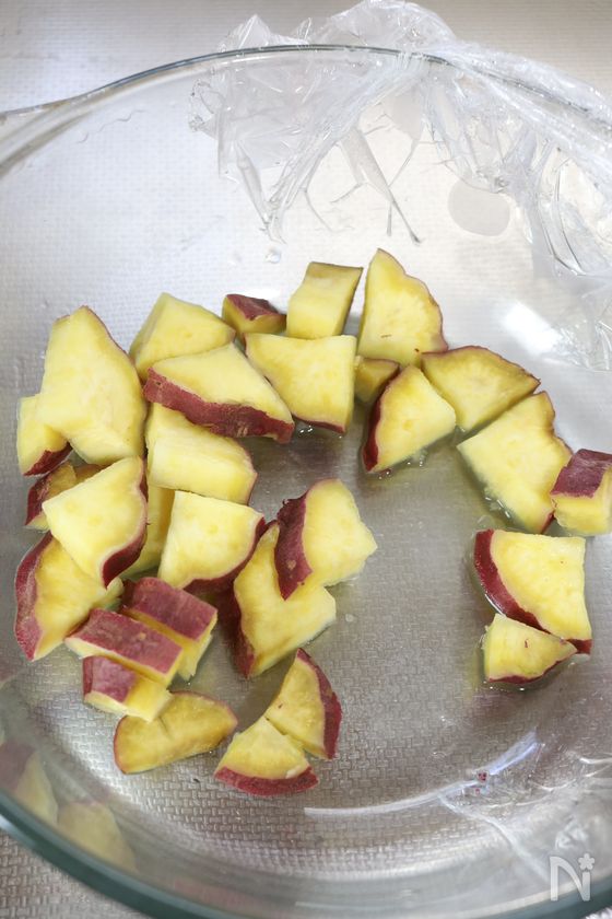 (2) 耐熱ボウルに水気を切った①のさつまいもと水大さじ1(分量外)を加えてラップをし、600Wのレンジで5分加熱する。(柔らかくなるまで)