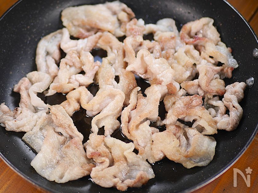 (2) ○フライパンに豚肉を綺麗に並べ、サラダ油(大さじ1、分量外)を加え、強めの中火で片面8割ほど焼いて焼き色を付ける。