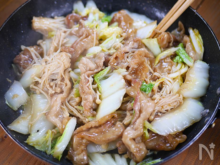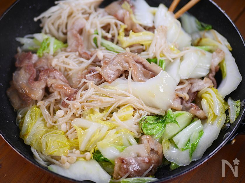 (3) 白菜とえのきを加え、強火で白菜が半分しんなりするまで炒め合わせる。