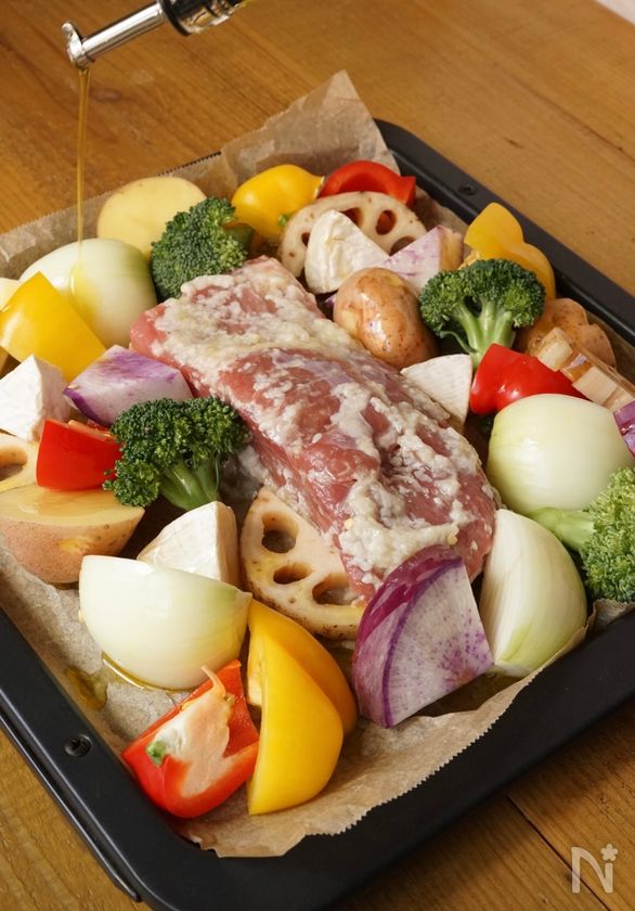 (2) 天板にオーブンシートを敷いて、豚バラ肉、お好みの野菜、カマンベールチーズを並べる。