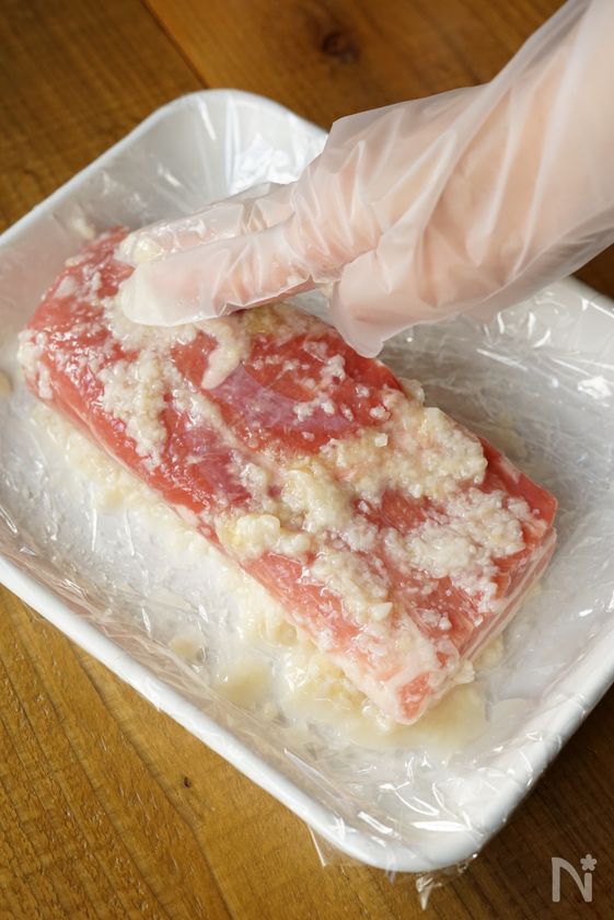 (1) 豚バラ肉(ブロック)の全面に【A】を塗って、3時間~ひと晩おく。