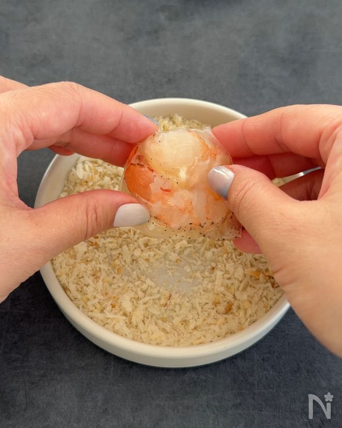 (3) 湿ったライスペーパーの粘着力でパン粉を付ける