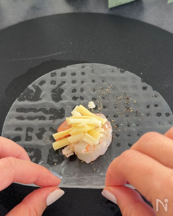 (1) ライスペーパーを両面濡らして、えびに塩胡椒をして下味をつけ、シュレッドチーズをのせる