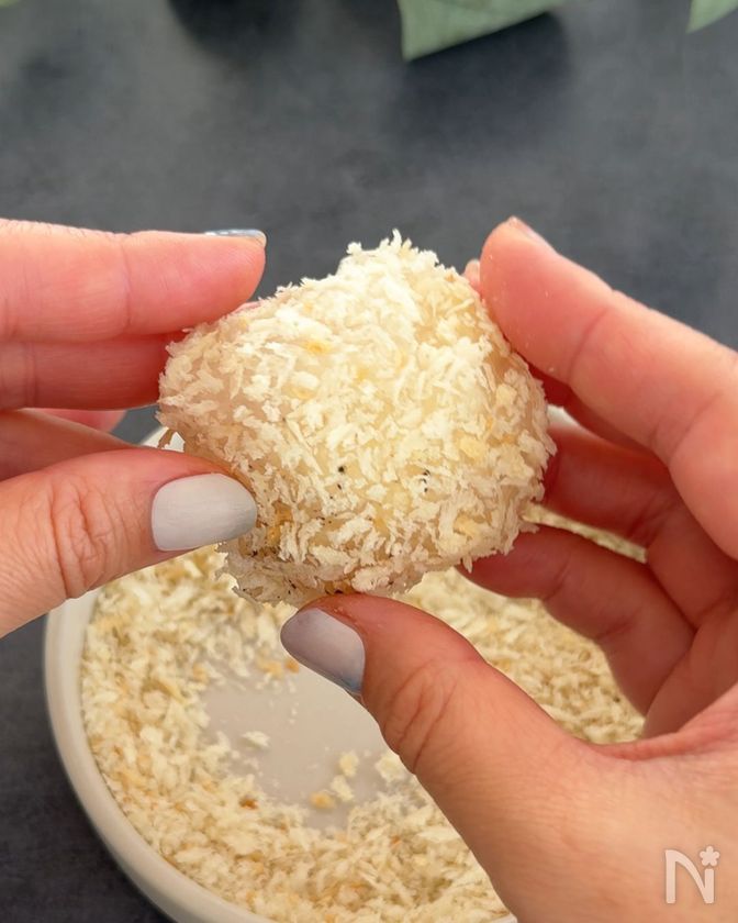 (2) キュッと巻いて一口サイズにし、そのままパン粉をまぶす