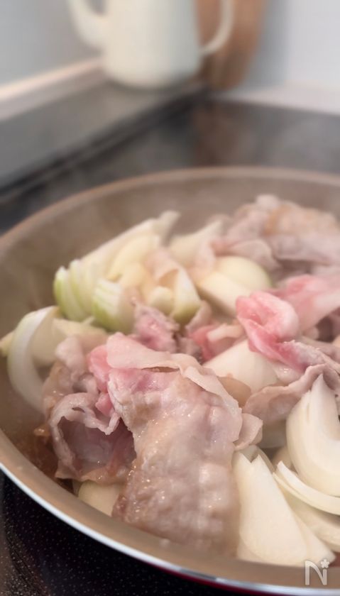 (2) 熱したフライパンに、豚バラ薄切り肉、玉ねぎを入れ、中火で5分炒める。