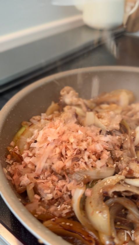 (3) 玉ねぎに火が通り、透き通ってきたら【A】を②に入れ、混ぜる。全体にたれが絡まったら、かつお節を入れ、サッと混ぜ合わせる。
