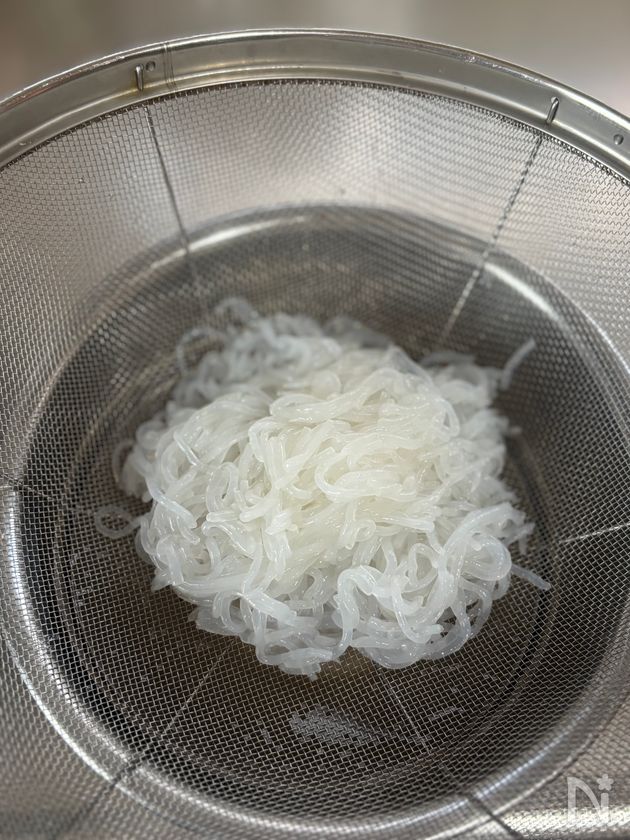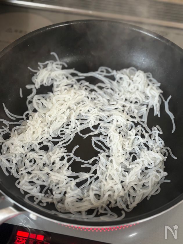 (3) フライパンに油をひかず、白滝を加えてキュッキュッと音がするまで乾煎りする。