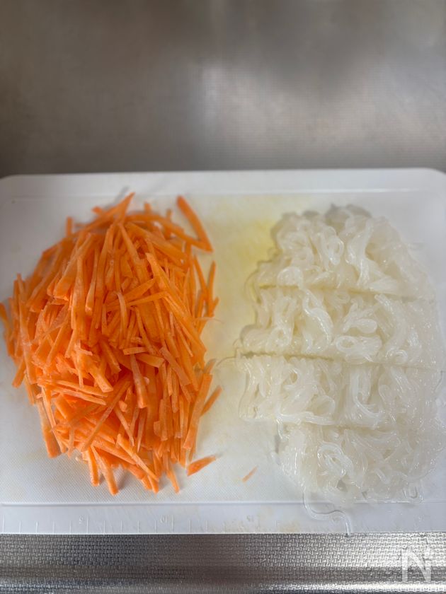 •にんじんの細切りは斜め薄切りにしてから、縦に切ると時短になります。