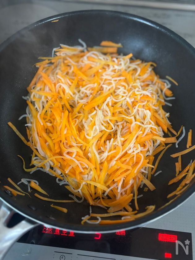 (4) 白滝の水分がとんだら、ごま油、にんじんを加えてにんじんがしんなりするまで炒める。