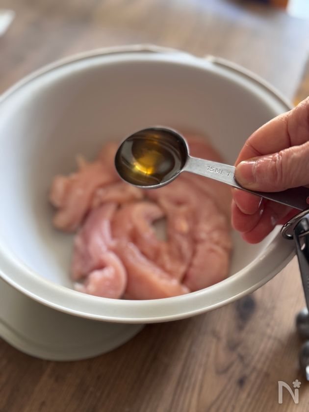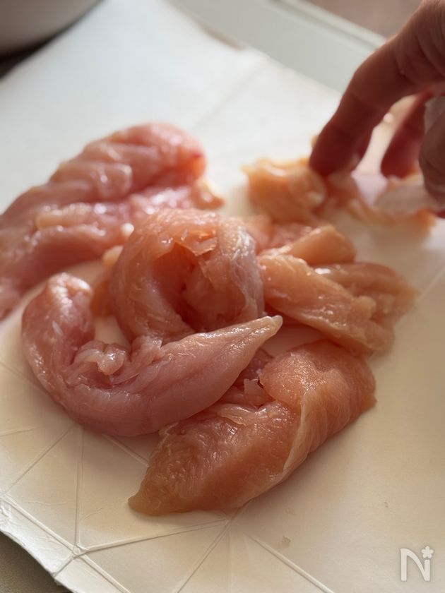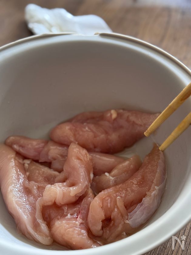 (下準備) ・若鶏ささみは水分をキッチンペーパーで拭いておく。
