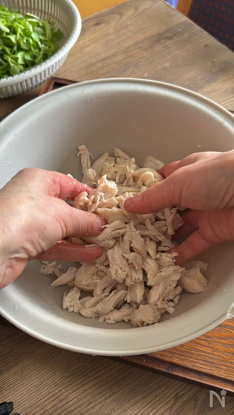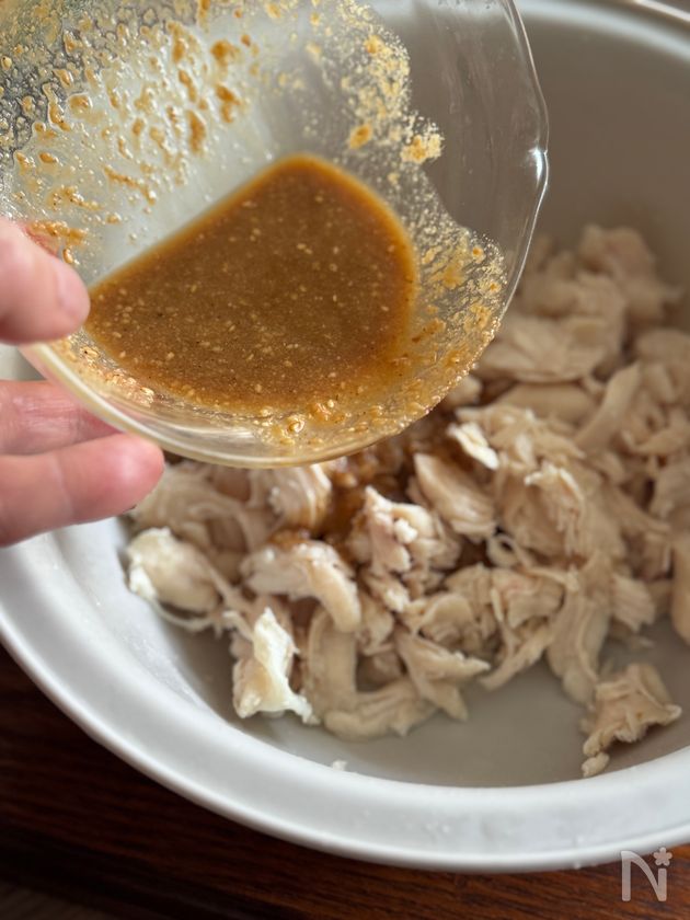 (7) 【A】と煮汁を加えたタレを入れてほぐした若鶏ささみと合わせる。