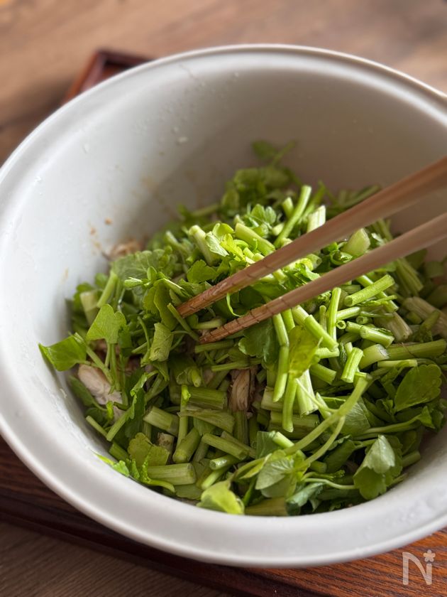 (8) 刻んでおいた春セリを入れ、ざっくりと混ぜる。