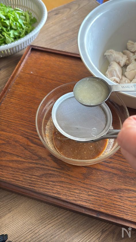 (5) 若鶏ささみに火が通ったら、※煮汁を大さじ1とって【A】のタレに合わせ混ぜておく。
