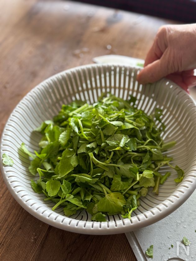 春のセリはやわらかく、生でもいただけます。ただ、根本は土が残りやすいので、流水で丁寧に洗うのがポイントです。