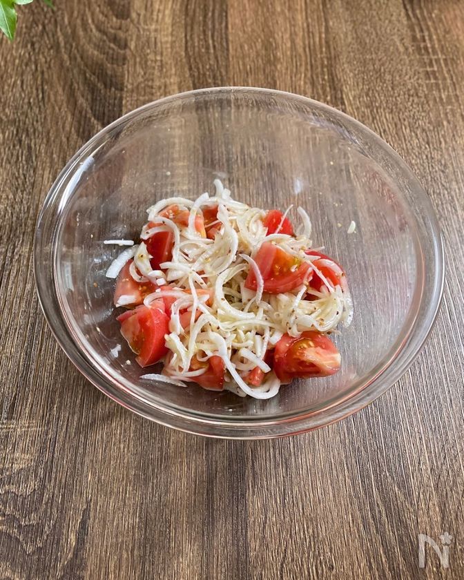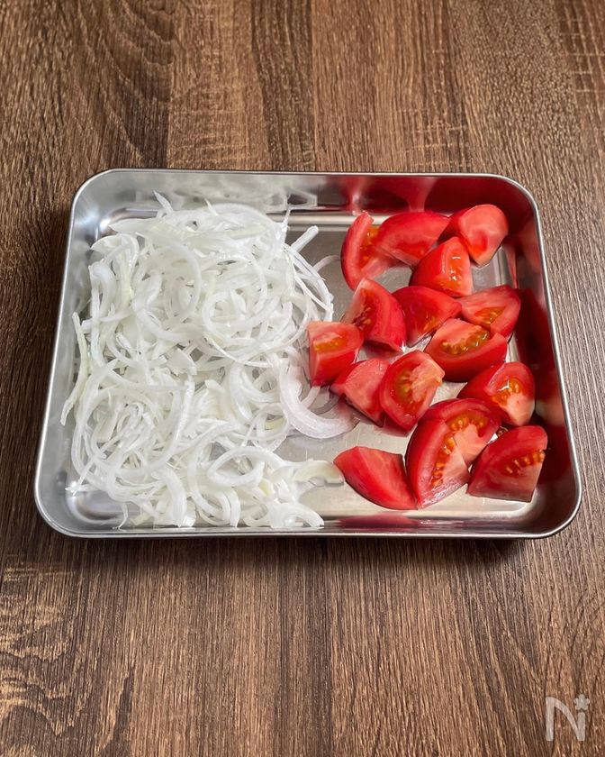 (1) 新玉ねぎは繊維を断つように薄切りにし、トマトは食べやすい大きさに切る。
