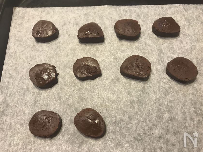 (4) 包丁で5ミリくらいの厚さに切ります。オーブンペーパーを敷いた天板に並べます。160度に予熱したオーブンで10分焼きます。