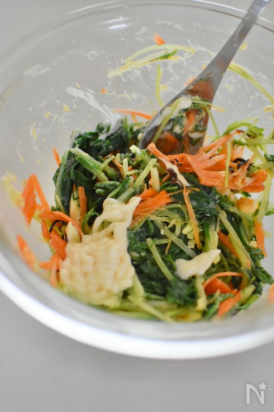 (2) 水菜が熱いうちに人参と顆粒鶏ガラスープの素、塩こんぶを加えて和える。あら熱がとれたらマヨネーズとゆで卵を崩しながら加える。