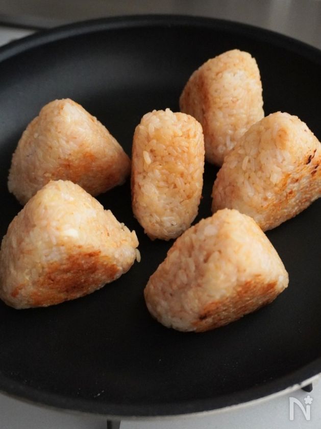 (2) フライパンにごま油をひき、中火にかけおにぎりを焼く。全面焼くと持ったときに崩れにくく、より香ばしさを感じられます。