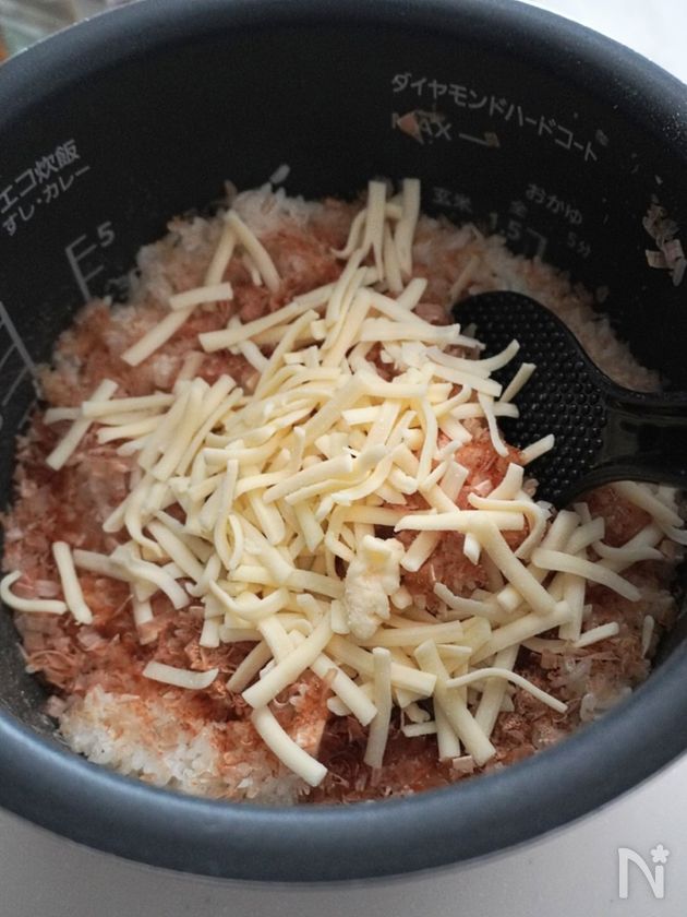 (1) 炊きあがったご飯にピザ用チーズ、醤油、鰹節、だしの素を加えて混ぜ、6等分しおにぎりを作る。