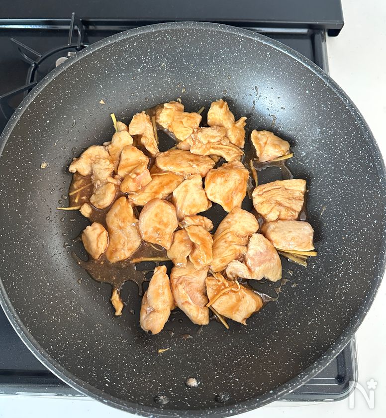 (3) フライパンに米油を中火で熱し、2、せん切りにしたペルー産しょうがを焼く。鶏むね肉に両面焼き色がついたら、砂糖、しょうゆ、みりん、酒を加えて煮詰める。